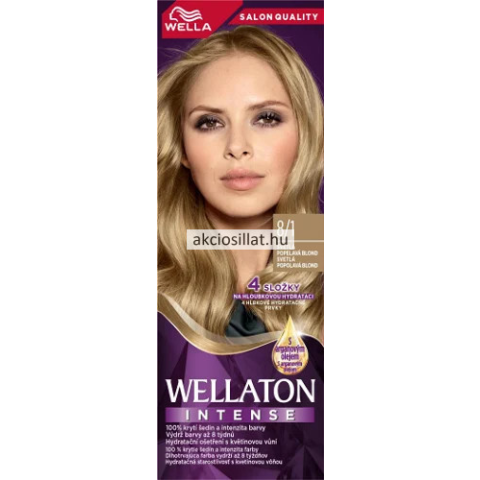Wella Wellaton tartós intenzív krémhajfesték 8/1 világos hamuszőke 50ml A doboz tartalma: 1 tubus krémhajfesték 50ml 1 db színelőhívó folyadék (6%) 50ml 1 intenzív hajfénykiemelő pakolás 10ml 1 használati utasítás 1 pár kesztyű