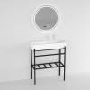 Welland Loft 3 elemes fürdőszobabútor szett, modern, loft stílusú alkotóelemekkel. A mosdótartó polcállvány minőségi rozsdamentes acél vázszerkezete és a 80 cm széles mosdókagyló tökéletes összhangot alkotnak. A széles mosdókagyló a teljes hosszában kiala