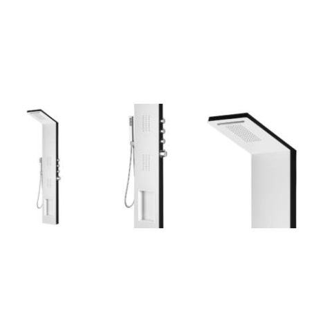 Wellis Bonita zuhanypanel Termék jellemzők: Méret: 240x1650 mm fehér és fekete, szinterezett alumínium zuhanypanel-test 50 tűfúvókás trópusi zuhany 2x24 tűfúvókás hidromasszázs Vízesés zuhany Kézitus Tusfürdőtartó polc Beépített termosztátos keverőszele