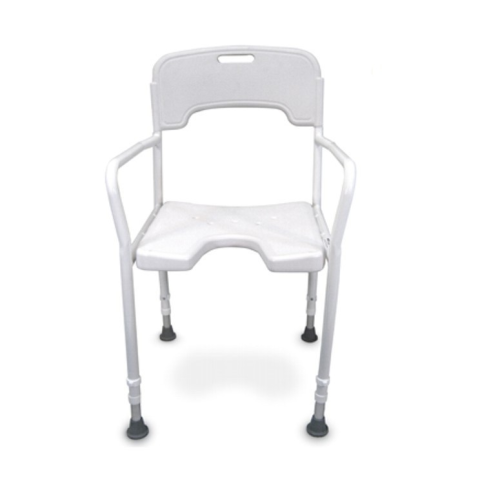 Karfás zuhany szék Tusoló szék karfás higi nyílással - DSR130 Tusolószék, háttámlával ellátva, könnyen tárolható, 4 lépésben állítható lábhossz, higiéniai nyílással ellátott. Fürdető szék tulajdonságok: Vízleengedő nyílások az ülőlapon. Könnyen tisztí