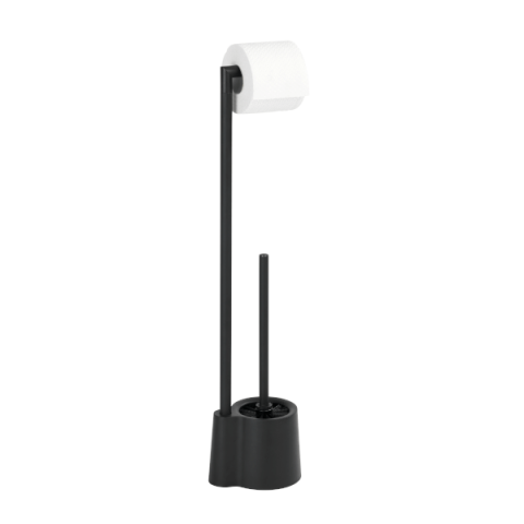 A WC-kefe tartó nehéz műanyagból, a WC-papír tartó rúd fekete matt, rozsdamentes nemesacélból készült.