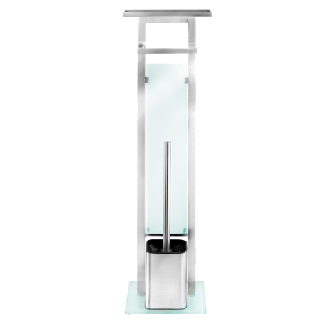 A fehér biztonsági üveg dekoratív eleme a WC-kefe garnitúrának, stabilitást biztosít, és eltakarja a pót WC-papírokat.