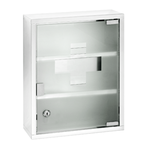 A dekoratív, kiváló minőségű gyógyszeres szekrény fényes rozsdamentes nemesacélból, a zárható ajtó szatén biztonsági üvegből készült.
