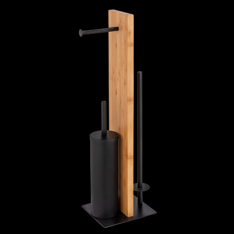 A garnitúra fekete talpon áll, és a WC-kefe tartó, a WC-papír tartó valamint a pót WC-papír tartó is matt fekete acélból készült, míg az állvány maga bambuszból, ezáltal az anyagok kombinációja egy rendkívül dekoratív garni