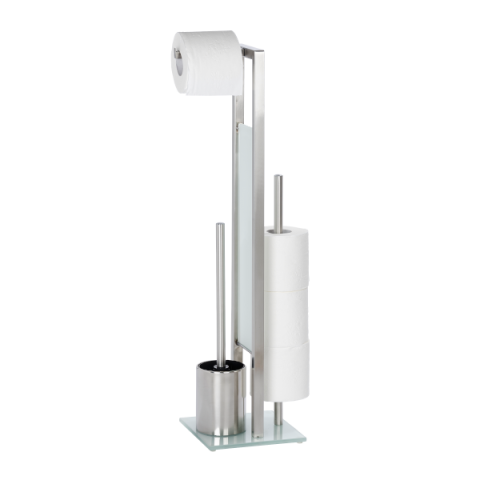 A fehér biztonsági üveg dekoratív eleme a WC-kefe garnitúrának, stabilitást biztosít, és eltakarja a pót WC-papírokat.