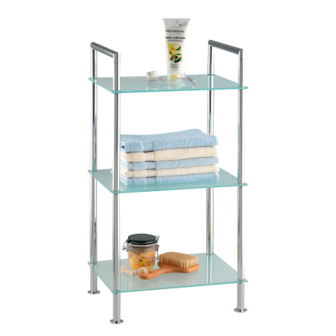 2 az 1-ben - a krómból készült elegáns Style dekoratív és praktikus módon kínál sok rakodó- és tárolóhelyet. A szatinált biztonsági üvegből készült 3 polcon sokrétű rakodóhely van a kozmetikai cikkek, fürdőszobai tartozékok és törölközők számára. A polc elegáns króm állványával és stílusos, szögletes kialakításával tűnik ki. Anyaga: króm/szatinált üveg Méretei (Sz x Ma x Mé): 37 cm x 71 cm x 28,5 cm