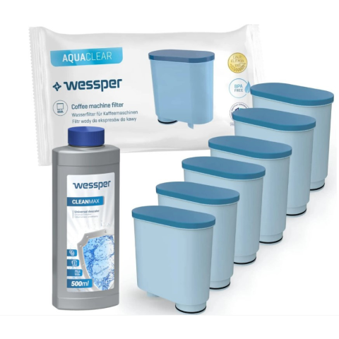 Ez a gazdaságos karbantartó csomag 6 db Wessper AquaClear vízszűrőt és egy ajándék 1 literes vízkőoldót tartalmaz. Használatával megvédheted kávégéped a vízkőtől és mindig tökéletes ízű kávét készíthetsz.