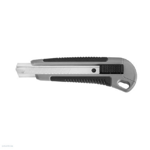Könnyű műanyag testű kés ergonómikus formájú lágy fogantyúval. 18 mm-es pengével. Szürke/fekete színű. 5 év garancia .