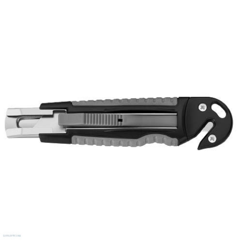 Univerzális kés 18mm-es trapéz pengével. Műanyag fogantyú puha markolattal. Automatikusan visszahúzódó penge. Szürke/fekete színű, TÜV tanúsítvánnyal. .