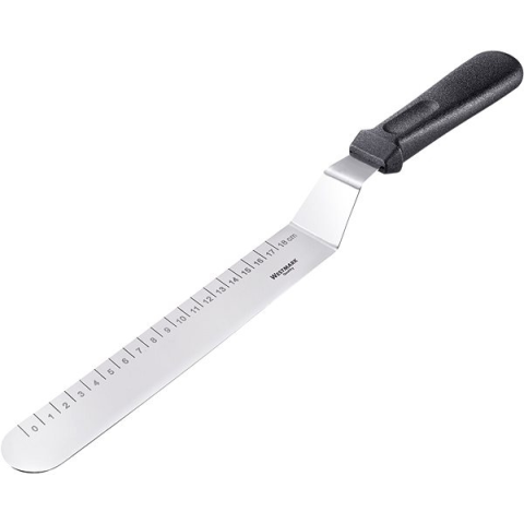 Konyhai spatula - cukrász, skálával, spatula anyaga rozsdamentes acél, markolat anyaga műanyag, mérete 38,7 × 3,5 cm (H×Sz), ezüst kivitel, 1 darabos csomag A WESTMARK praktikus tortakenőjével könnyedén oszlathatod el a krémet, a bevonót és a tejszínhabot a tortán. A hajlított eszköz jó fogású nyele műanyagból, pengéje rozsdamentes acélból készült. A peng