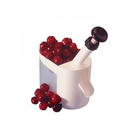 Műanyagból készült meggymagozó Használata egyszerű és gyors: a magok a tárolóedénybe esnek, a magozott gyümölcs meg a nyíláson gurul ki az aláhelyezett tálba