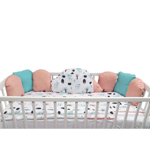Egyedi, modern mintás rácsvédő, ami tükéletes kiegészítője a babaszobának. A képen a kiságy mérete 60x120cm Tartalma: 7 db külön-külön rögzíthető rácsvédő párna Anyaga: huzat: 100% pamut töltet: 100% poliészter Tisztítás: Semleges, színvédő mosószere
