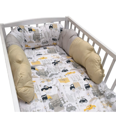 Egyedi, modern mintás rácsvédő, mely tökéletes kiegészítője a babaszobának. A képen egy 60x120cm-es kiságyban látható. Anyaga: huzat: 100% pamut töltet: 100% poliészter Tisztítás: Semleges, színvédő mosószeres vízben, mosógépben kímélő programon, maxi
