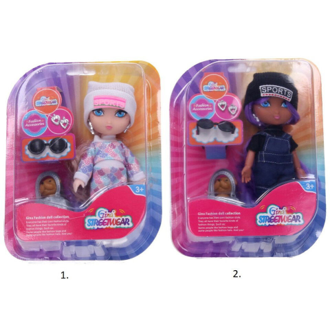 Baba színes ruhában, hosszú hajjal. A csomag tartalmaz egykutyust táskában, szemüveget és fülbevalót.