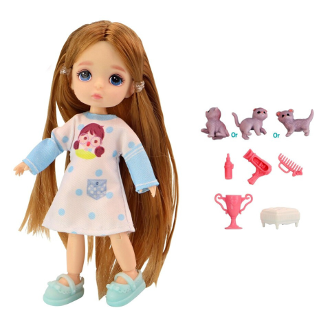 Sada bábiky a mačky. Veľkosť bábiky 12,5 cm. Pohyblivé kĺby.
