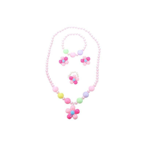 Gyöngyös divatszett virággal, karkötővel, nyaklánccal és fülbevalóval. A nyaklánc hossza kb. 19 cm.