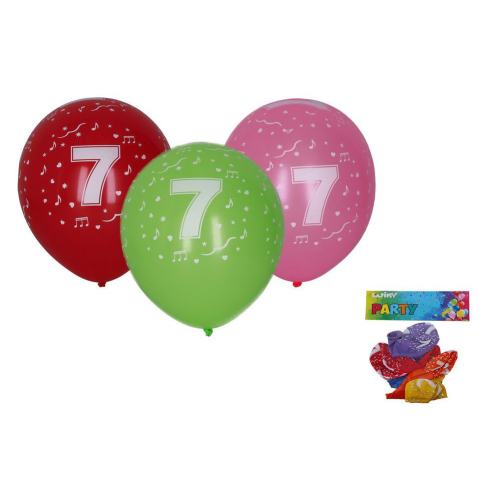 Színes lufik 7 es számmal a születésnapi partik díszítésére.