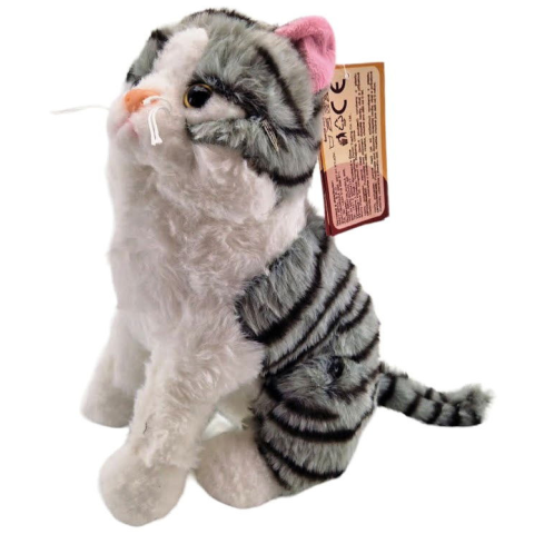 Plyšová šedo-biela mačka.