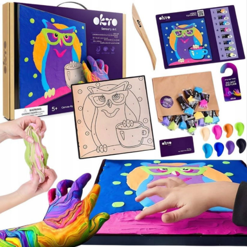 A Sensory Art Air Clay festékes készlet egy egyedülálló művészeti termék 5 éves kortól gyermekek számára. Tartalmaz egy 29 x 29 cm-es kemény szőnyeget előre nyomtatott bagoly motívummal, amely egyszerű és csábító vizuális történetként szolgál kisgyerm