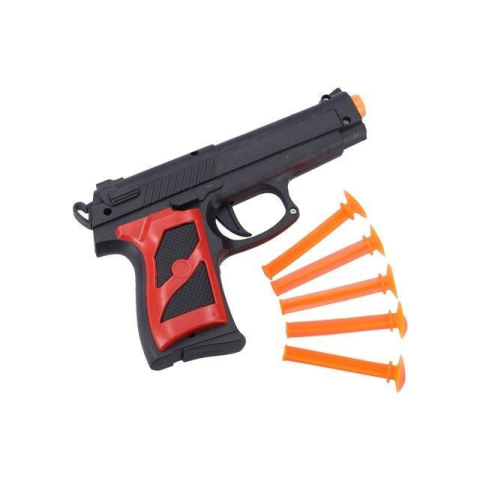Pisztoly tapadfókoronggal A tolvajokra mindig fel kell készülni. A pisztoly műanyagból készült. A tapadókorongos töltények mindegyike gumiból van és 6 cm hosszú. Pisztoly mérete : 17 cm Töltények száma : 5 db