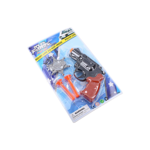 Egy rendőrségi pisztoly a törvény bátor őrének. A készlet jelvényt, pisztolyt és 2 szívókorongos töltényt tartalmaz.