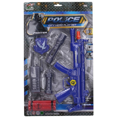 Rendőrségi készlet effektekkel. A csomag tartalmaz egy géppisztolyt, zseblámpát, jelvényt, rádiót, gránátot, dinamitot. A géppisztoly fény és hangeffektusokkal rendelkezik.