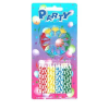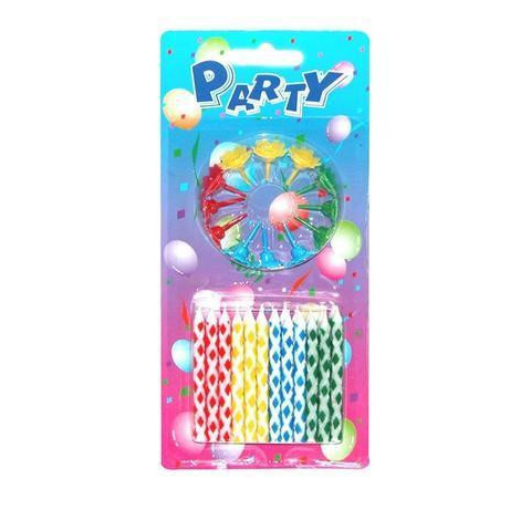 Az élénk színekkel díszített gyertyák kiválóan alkalmasak elsősorban gyereksütemények díszítésére. A csomag 24 gyertyát, 4 színben tartókkal együtt tartalmazza.