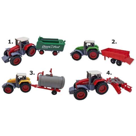 Fém traktor kivehető műanyag pótkocsival. Különböző pótkocsik 4 változatban.