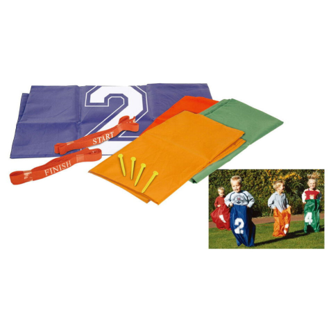 Négy színes táska, amelyek számszerűen is megkülönböztethetők a gyerekek versenyugrásához. Alkalmas iskolába és otthoni kertbe is. A csomag a rajtot és a célt jelölő hevedereket is tartalmaz – egyszerűen helyezze őket a fűre.