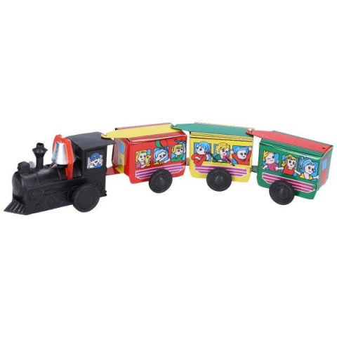 Fém mozdony kulccsal ffelfúzható, kocsikkal. A csengő csilingelő hangot ad ki .