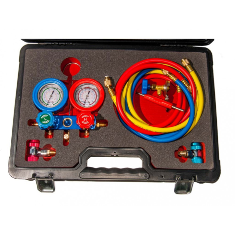 Légkondi nyomás ellenőrző készülék. Típus: 2-utas Felhasználás: R134A, R-410A, R-22 hűtőközeghez A készlet tartalma: - 2-utas csaptelep folyadéknézővel. - Kék mérőóra az alacsony nyomású oldalhoz: 0-35bar (0-500psi) - Piros mérőóra a magas ny