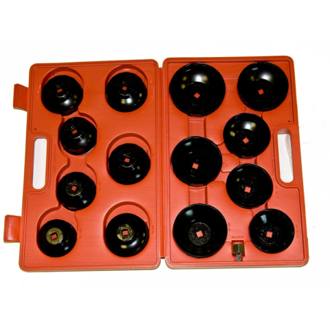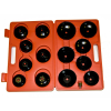 Olajszűrő leszedő készlet. 15darabos A dugókulcs kialakítás csökkenti az olajszűrő sérülésének a kockázatát. A készlet 14db szűrőleszedő dugókulcsot, és egy szűkítő adaptert tartalmaz. Meghajtás: 3/8; A készlet tartalma: - 14db dugókulcs; méret