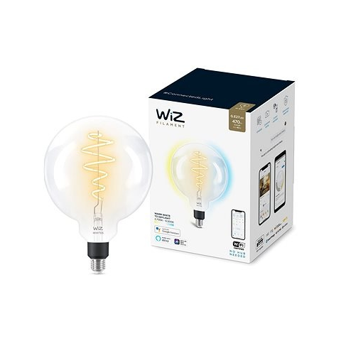 LED izzó - okos funkciókkal, G energiaosztály, 6,5 W energiafelhasználás, 230 V feszültség, szabályozható fényerő, 470 lm fényáram állítható színhőmérséklet (2700-6500 K), 90 Ra színvisszaadási index (CRI), WiFi 2,4 GHz csatlakozás, Samsung SmartThings, IFTTT kompatibilitás, angol nyelvű alkalmazással, 15000 óra élettartam Intelligens izzóWIZ Tunable White FILAMENTÉlvezd a még nagyobb kényelmet a mindennapokban a WiZ tompítható, E27 foglalatú intelligens LED iz