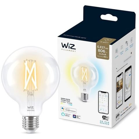 LED izzó - okos funkciókkal, E energiaosztály, 6,7 W energiafelhasználás, 230 V feszültség, szabályozható fényerő, 806 lm fényáram állítható színhőmérséklet (2700-6500 K), 90 Ra színvisszaadási index (CRI), WiFi 2,4 GHz csatlakozás, Samsung SmartThings, IFTTT kompatibilitás, angol nyelvű alkalmazással, 15000 óra élettartam Okos izzóWIZ TUNABLE WHITE FILAMENTÉlvezd a még nagyobb kényelmet a mindennapokban a WiZ 6,7 W teljesítményű, szabályozható, E27 foglalat