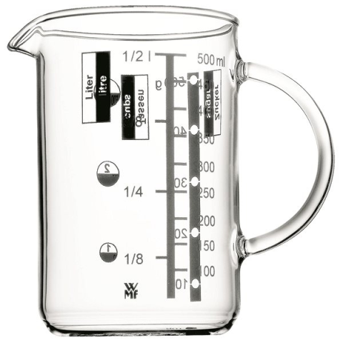 Mérőpohár - üveg, mért egységek ML és G, teljes űrtartalma 500 ml, fül a csomag része, mérete 12 × 8 cm (Ma×Sz), átlátszó kivitel Select brand:BevezetésFontos információkGalériaMűszaki adatokWMF0605962000 Gourmet üveg mérőedényA Gourmet termékcsalád új WMF 0605962000 mérőedényével teljesen kézben tarthatod a folyadékok és ömlesz