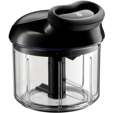 Aprító - kézi, püré, salsa, dresszingek és egyebek készítéséhez, ergonomikus fogantyú, 2 rozsdamentes acél penge, csúszásmentes alap, mosogatógépben mosható, űrtartalma 0,9 l, fekete szín A WMF 1876786040 kézi aprító segítségével különböző típusú összetevőket apríthatsz és vághatsz fel, így használhatod salsák, pürék, öntetek és más ételek elkészítéséhez. Az aprítót a kényelmes, ergono