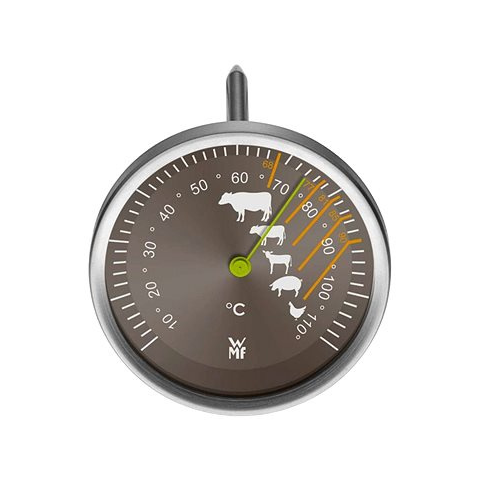 Konyhai hőmérő - húshoz (marha-, borjú-, bárány-, sertés- vagy baromfihús), a kijelzőn látható illusztrációk az ideális hőmérsékleti tartományt ábrázolják, mérési tartomány: 10°C - 110°C, akár 250°C-ig hőálló, sütés közben a sütőben hagyható, Cromargan® 18/10-es rozsdamentes acél, hőálló üveg, kézi mosás A megbízható WMF mechanikus konyhai hőmérője egy igazán praktikus konyhai segédeszköz. Egy érzékelőt tartalmaz, amellyel megmérhetjük a