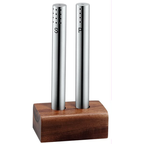 Asztali fűszertartó - 2 darabos készlet sóhoz és borshoz, anyaga acél, magassága 150 mm A szokatlan formájú és ízléses kialakítású só és bors fűszerkészlet minden asztal dísze lesz. A WMF 634546040 egy akácfából készült talapzatot és egy kiváló minőségű matt rozsdamentes acélból
