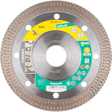 A sarokcsiszolóhoz használható Wolfcraft Pro Ceramic gyémánt vágókorong 1,4 mm-ével szuper vékony, és a legfinomabb gyors vágásokhoz is használható. A vágókorong szinterezett, zárt éllel és lépsejt struktúrával rendelkezik. Emellett megerősített karimája gondoskodik a biztonságos használatról. Könnyedén vághatók vele az olyan anyagok, mint a gránit, kőporcelán, csempe vagy kerámia lap. A gyémánt vágókorong mindeközben nyugodt futásról és stabil vágás