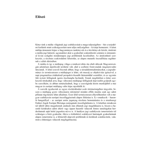A könyv, mely átmenet a hagyományos tankönyvek és a kézikönyvek között, a média világának jogi szabályozását mutatja be. Áttekinti a média jogi hátterét, ugyanakkor útmutatóként szolgál a mindennapos jogi problémák kezeléséhez.