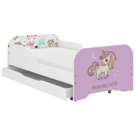 MIKI Unikornis Gyermekágy 140x70 cm - Álomszép pihenés a kicsiknek 🦄 Ez a bájos MIKI gyerekágy, unikornis mintával, tökéletes választás a kislányok számára. A 140x70 cm-es alvási felület elegendő helyet biztosít a kényelmes alváshoz, míg az oldalpro...