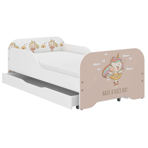 MIKI gyerekágy 140x70 cm: Balerina unikornis mintával, matraccal és ágyneműtartóval 🦄 Ez a gyönyörű MIKI gyerekágy tökéletes választás a kislányok számára! Balerina unikornis mintájával vidám és álomszerű hangulatot teremt a gyerekszobában. Az ágy...
