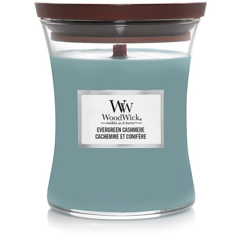 Gyertya - illatos, mindennapi használatra való, fás illat, fa kanócos, üvegedény, kerek alakú, anyaga szójaviasz, zöld kivitel, égési idő 65 óra Az egyedi kényelem és otthonosság hangulatát segít megteremteni a dizájnos WoodWick Evergreen Cashmere gyertya. Lakásodban vagy irodádban friss fenyőillat, tiszta levegő, meleg fűszerek és szantálfa a