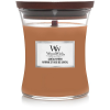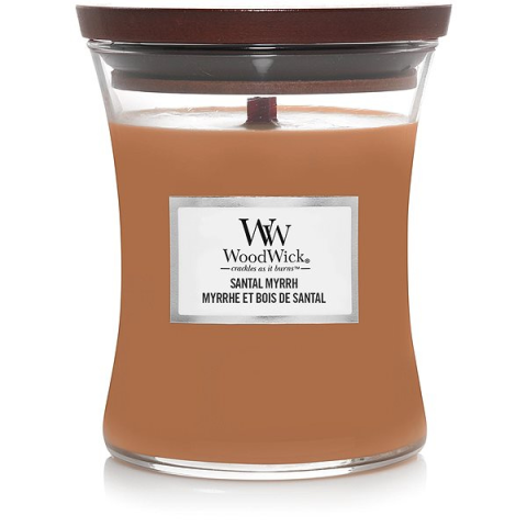 Gyertya - illatos, mindennapi használatra való, gyümölcsös illat, fa kanócos, üvegedény, kerek alakú, anyaga szójaviasz, zöld kivitel, égési idő 30 óra A WoodWick Santal Myrrh gyertya fás illatával segít megteremteni a kényelem és az otthonosság egyedi hangulatát. A mahagóni, a mirha, a vanília és az eukaliptusz illata elkezd terjedni a lakásban vagy