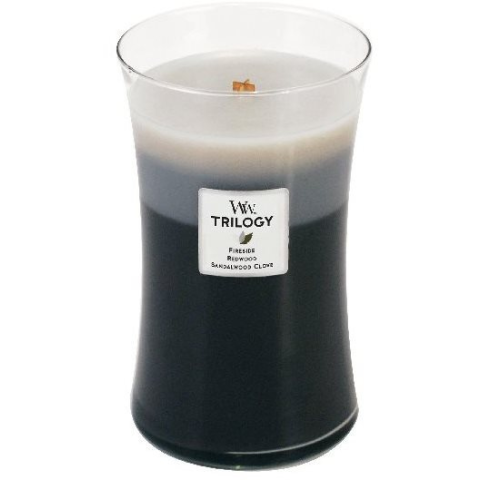 Gyertya - illatos, mindennapi használatra való, fás illat, fa kanócos, üvegedény, henger alakú, anyaga szójaviasz és paraffin, többszínű, égési idő 130 óra A vonzó Trilogy Warm Woods (Meleg fák) nagy gyertya három fás illat egyedülálló kombinációja, amelyek rétegenként olvadnak el. Elegáns pohárban, jellegzetes fa tetővel, a híres amerikai WoodWick illat