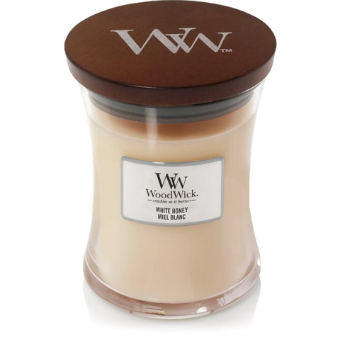 Gyertya - illatos, mindennapi használatra való, üde és édes illat, fa kanócos, üvegedény, henger alakú, anyaga szójaviasz, bézs kivitel, égési idő 65 óra A dizájnos WoodWick White Honey gyertya friss és édes illatával segít megteremteni a kényelem és az otthonosság egyedi hangulatát. Az édes kandírozott narancsvirág és vaníliás orchidea álomszerű illat