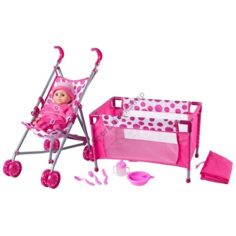 A te gyermeked is folyton segíteni akar neked a kisbaba körül? Akkor ez a Woody babakocsi szett kiváló választás a számára. Biztosan tetszeni fog neki az aranyos baba, akit mindenhová magával vihet. A baba tud pislogni és hangot kiadni. Ebédidőben megetetheted őt a saját étkészletéből, amely tálat, poharat és evőeszközöket tartalmaz. Élvezni fogja, hogy etetheti és babakocsiban tolhatja, és azt is, hogy ha ellátogat valahova, ott beteheti a babát az összecsukhat