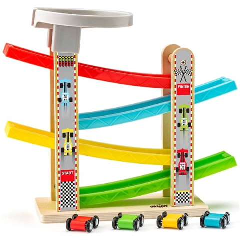 Autópálya a legkisebb autórajongóknak és versenyzőknek. A gyermek az autókat a pálya felső felületére helyezi, megdönti, és az autók végigmennek a pályán. A gyermek finom motorikus készségeit és szem-kéz koordinációját fejleszti a játék e szórakoztató formája során. A színes, már ránézésre is szórakoztató pálya négy különböző színű autót tartalmaz egyszerű kialakításban, ideális a végtelen versenyzői kalandokhoz.