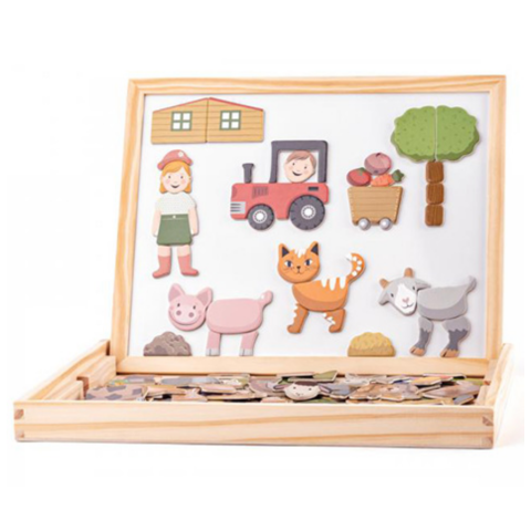Ez a fa kerettel ellátott mágnestábla egészen biztos, hogy a gyerekek egyik kedvenc játéka lesz, hiszen a csomagban található mágneses darabok segítségével különféle állatokat lehet összeállítani a tábla sima részén, ráadásul még nagyobb mókának ígérkezik, ha az állatok egyes darabjait összekeverjük. A tábla másik oldala olyan kialakítást kap