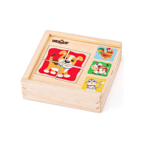 Ez az aranyos, állatos mini fa puzzle tökéletes választás a kisgyermekek számára, akik imádnak játszani és tanulni egyszerre. A Woodyland által készített puzzle négy különböző kedves állatfigurát tartalmaz: egy kutyust, egy cicát, egy tehenet és egy kakast. Minden állat képét négy kis darabra bontva kell összerakni, így a gyerekek fejleszthetik a kézügyességüket, a